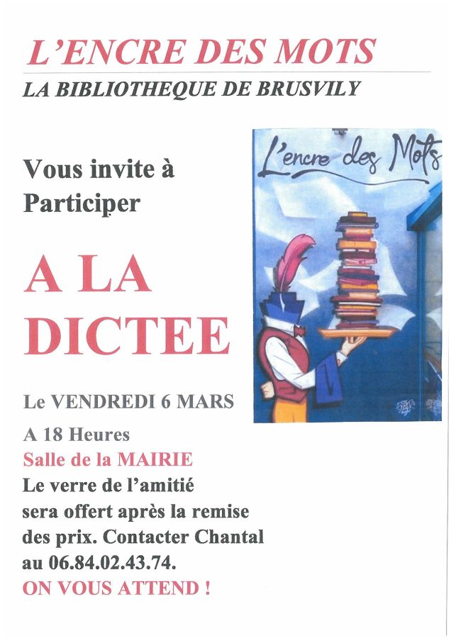 Dictée Actualités le 06 mars 2026 Accueil Vivre à Brusvily Actualités Dictée Retour 26-02-2026 La Bibliothèque "L'Encre des Mots" organise une dictée le vendredi 06 mars 2026 à 18 heures à la salle d'honneur de la mairie